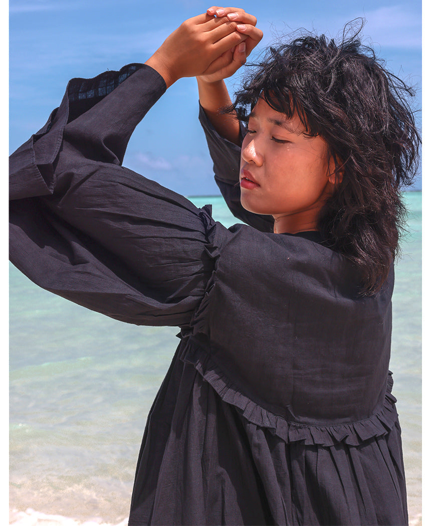 A gathered midi dress with flared sleeves featuring a round neck. Length 45". The model is 5'7" and is wearing a size M.