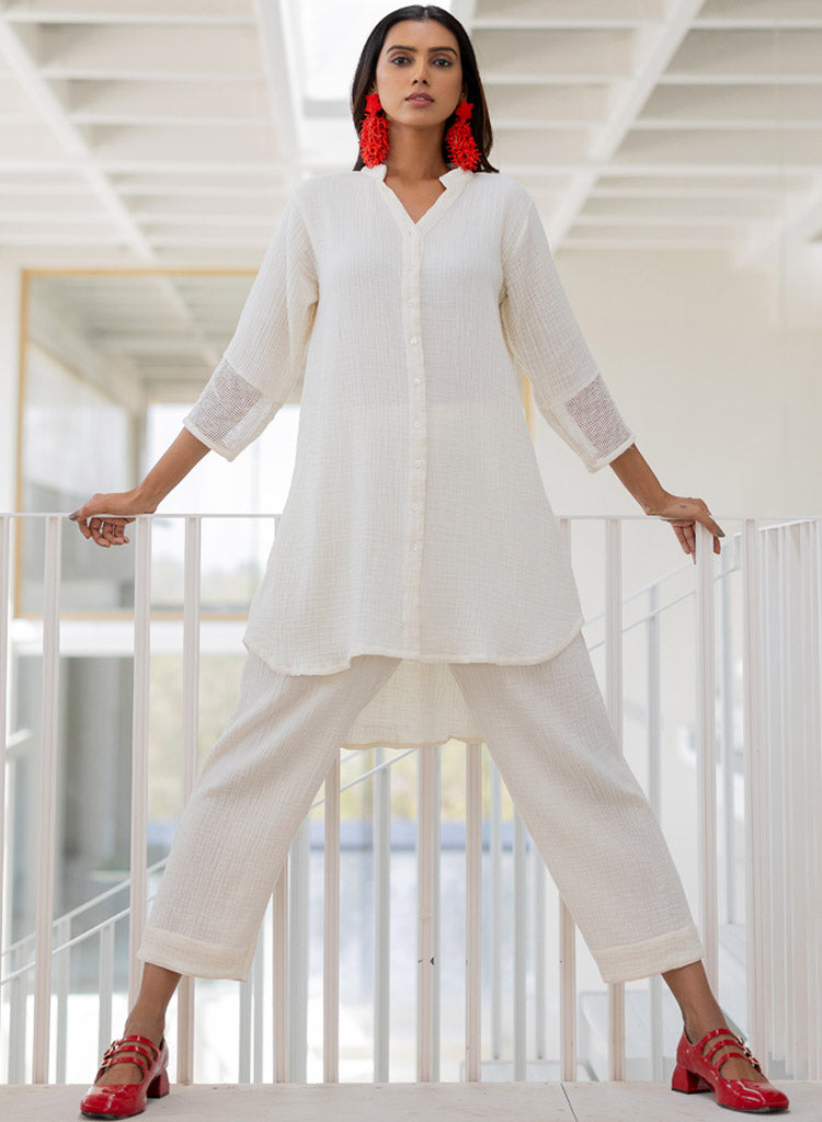 A two-piece set pairing the Vanilla Mist Tunic and matching pants. The relaxed fitting button-down tunic features mesh sleeve detailing. Front length 34", Back length 38". The matching straight leg pants feature an elasticated waist and inseam pockets. Length 36". The model is 5'7" and is wearing size M.