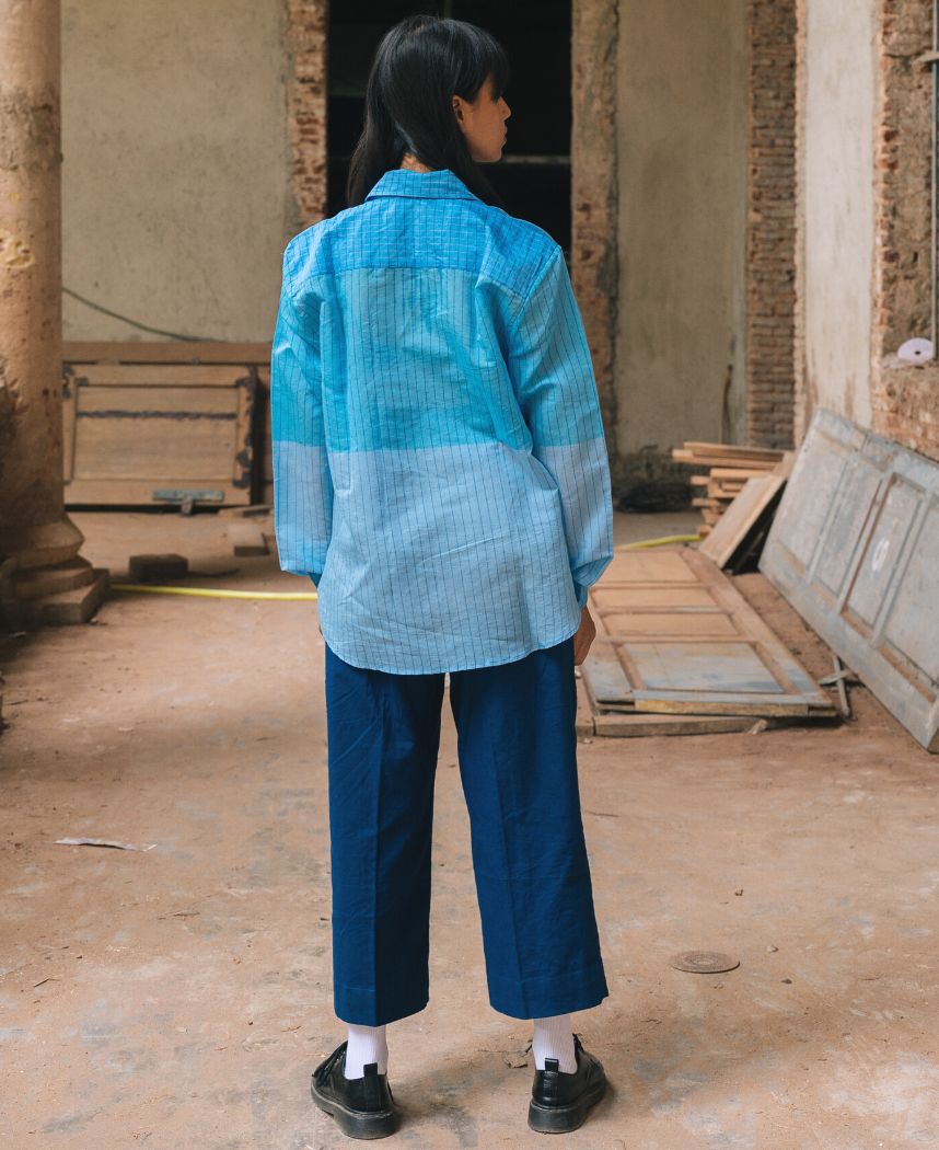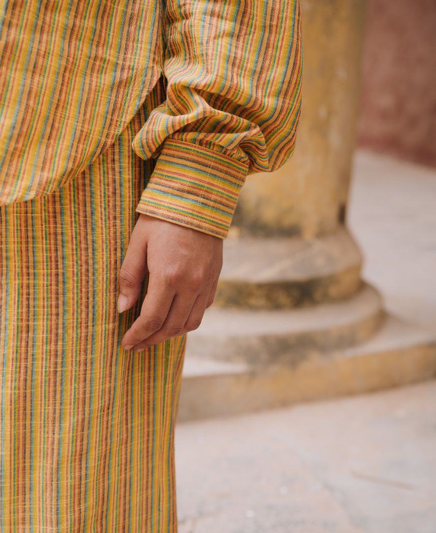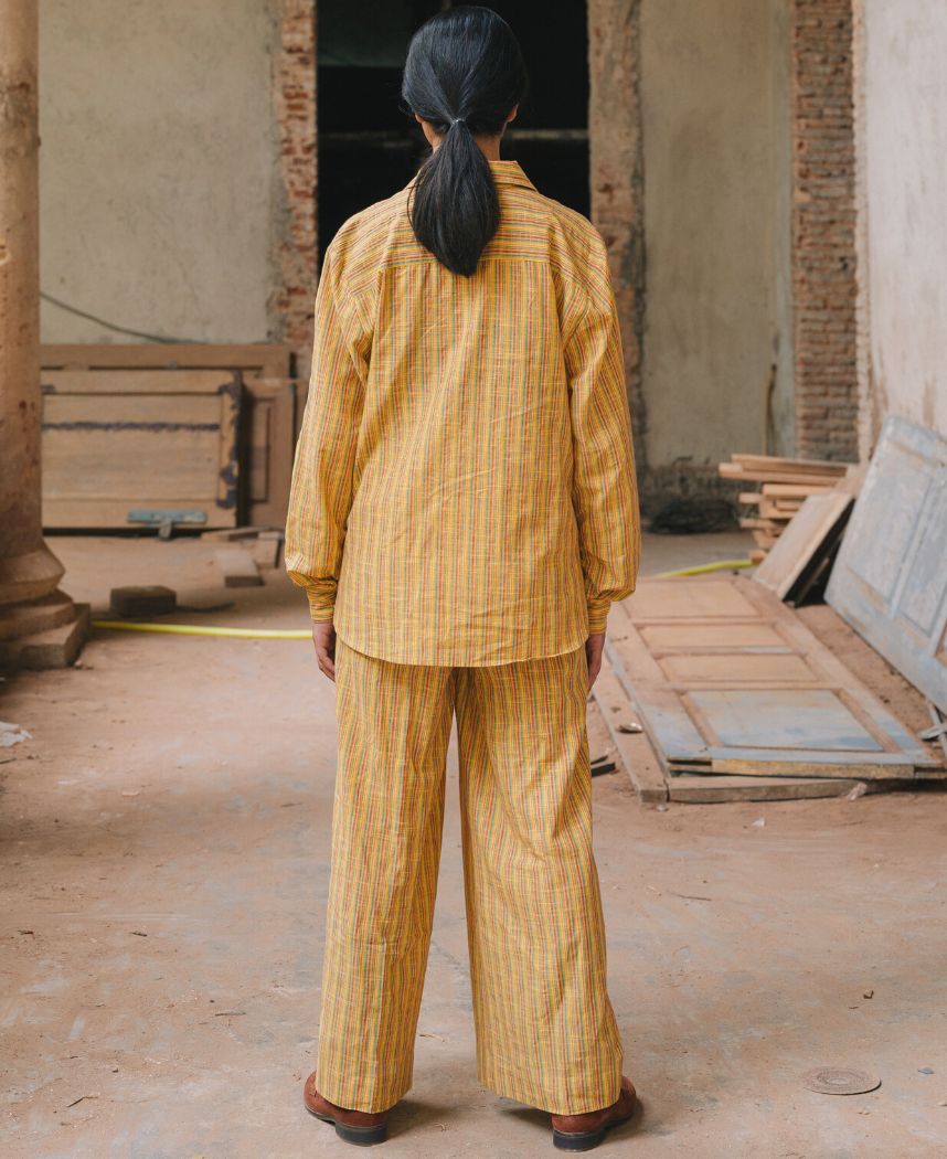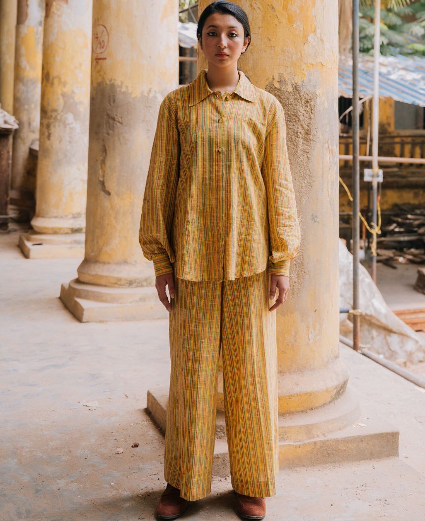 A striped shirt featuring a point collar, a half-concealed front button placket and a curved hem. Length 28". The model is 5'6" and is wearing a size S.