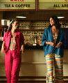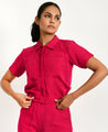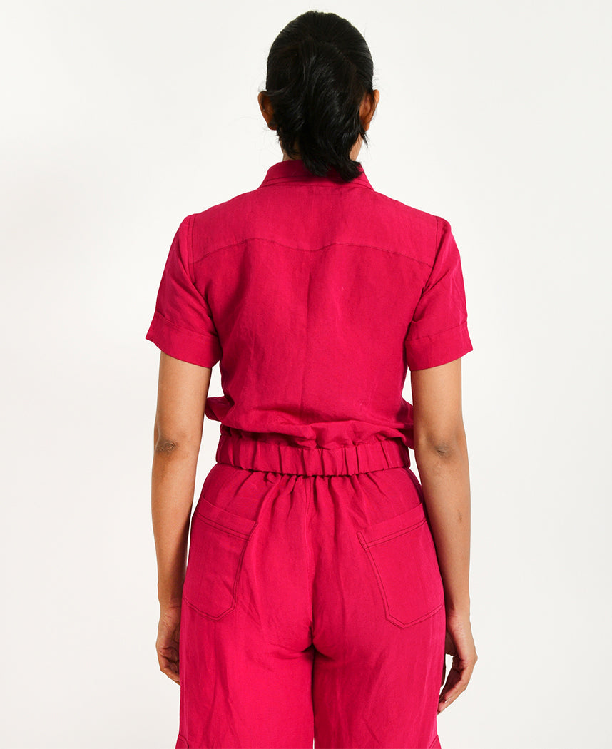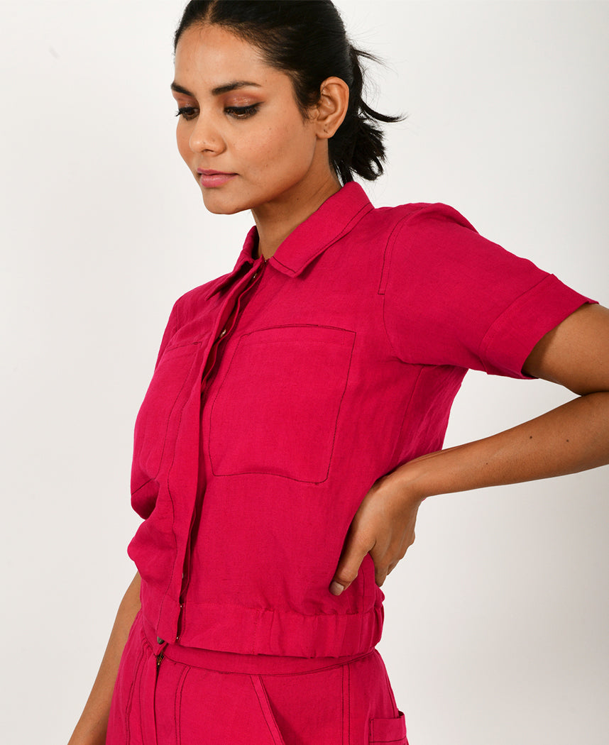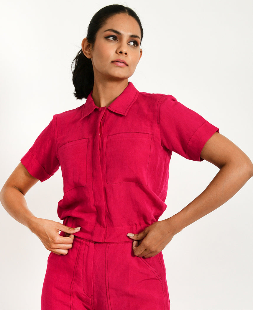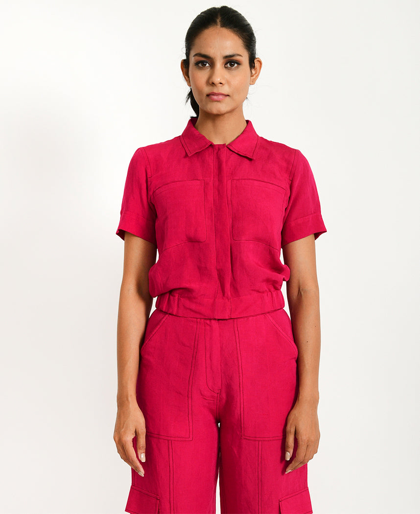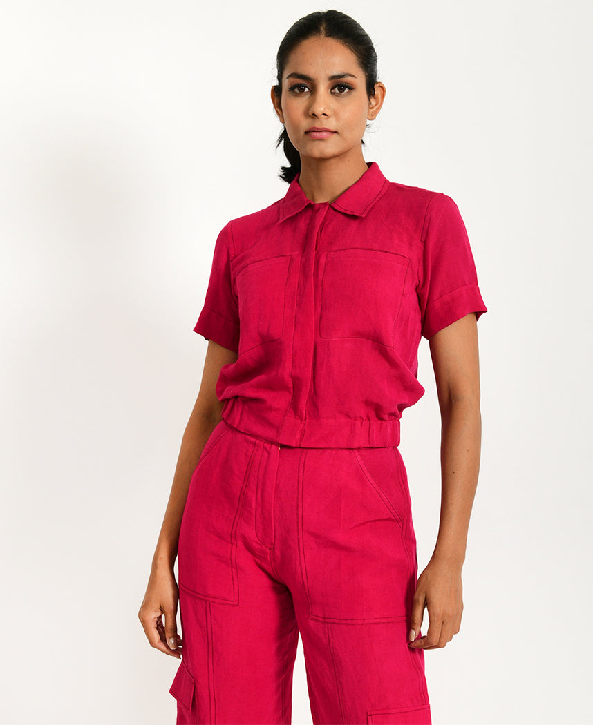 A crop top with an elasticated hem featuring a pointed collar, a concealed front button placket and patch pockets. Length 20".