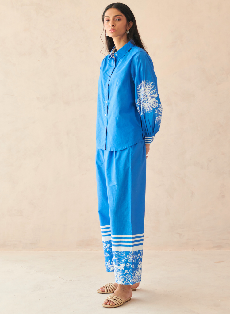 A floral printed button down shirt featuring a classic collar, gently puffed cuffs, a back yoke and a curved hem. The model is 5'9" and is wearing a size S.