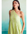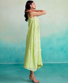 A relaxed-fitting maxi dress with an off-shoulder and drawstring waist featuring inseam pockets, hand embroidery, and hanging details. Length 52". The model is 5'8" and is wearing a size S.