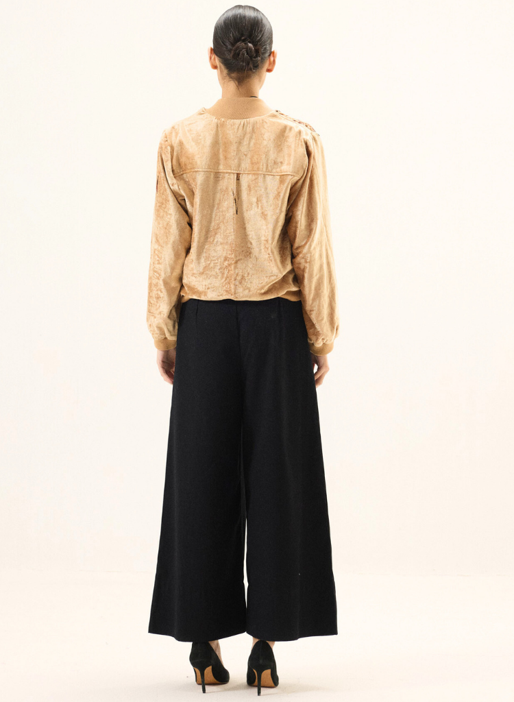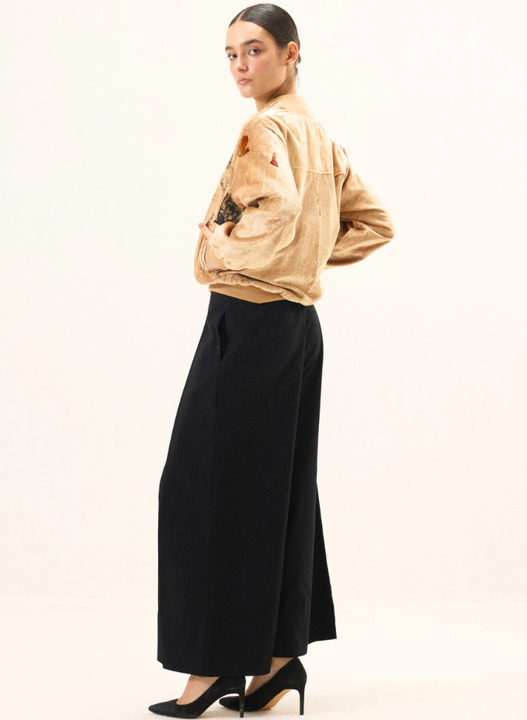 A pair of pants with refined front pleats featuring two functional side pockets and a fluid fall. Length 41". The model is 5'6" and is wearing a size S.
