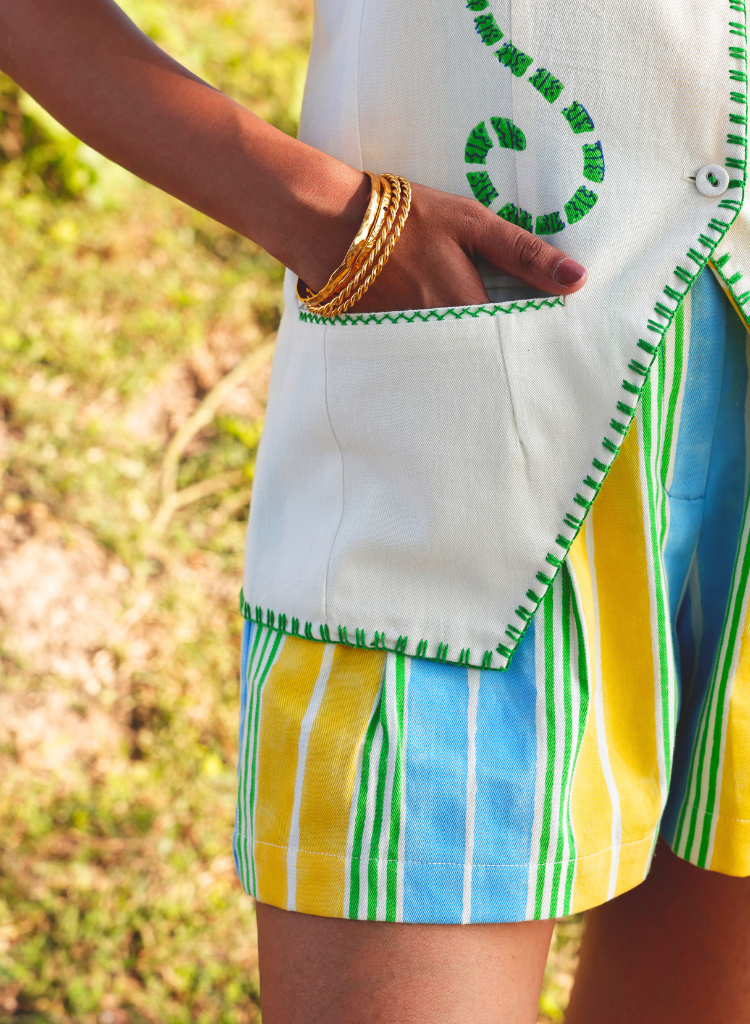 A two-piece set pairing the Vrinda Vest and the Mango Shorts. The block printed vest features playful monkey motifs and hand-embroidered details. The hand block-printed shorts in vibrant multi-colour stripes feature an elasticated back and front button closure for a secure yet flexible fit. The model is 5'8" and is wearing size XS.