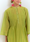 An A-line kurta with pintuck and zari details featuring a round neck, a half button placket, wide sleeves and side slits. Length 47”. The model is 5'9" and is wearing a size XS.