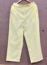 A pair of handblock printed checkered pants featuring a fitted waist and inseam pockets. Length 40”. The model is 5'9" and is wearing a size XS.