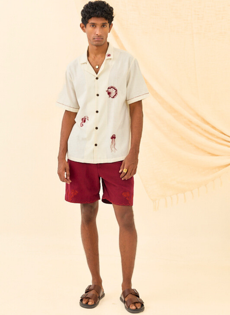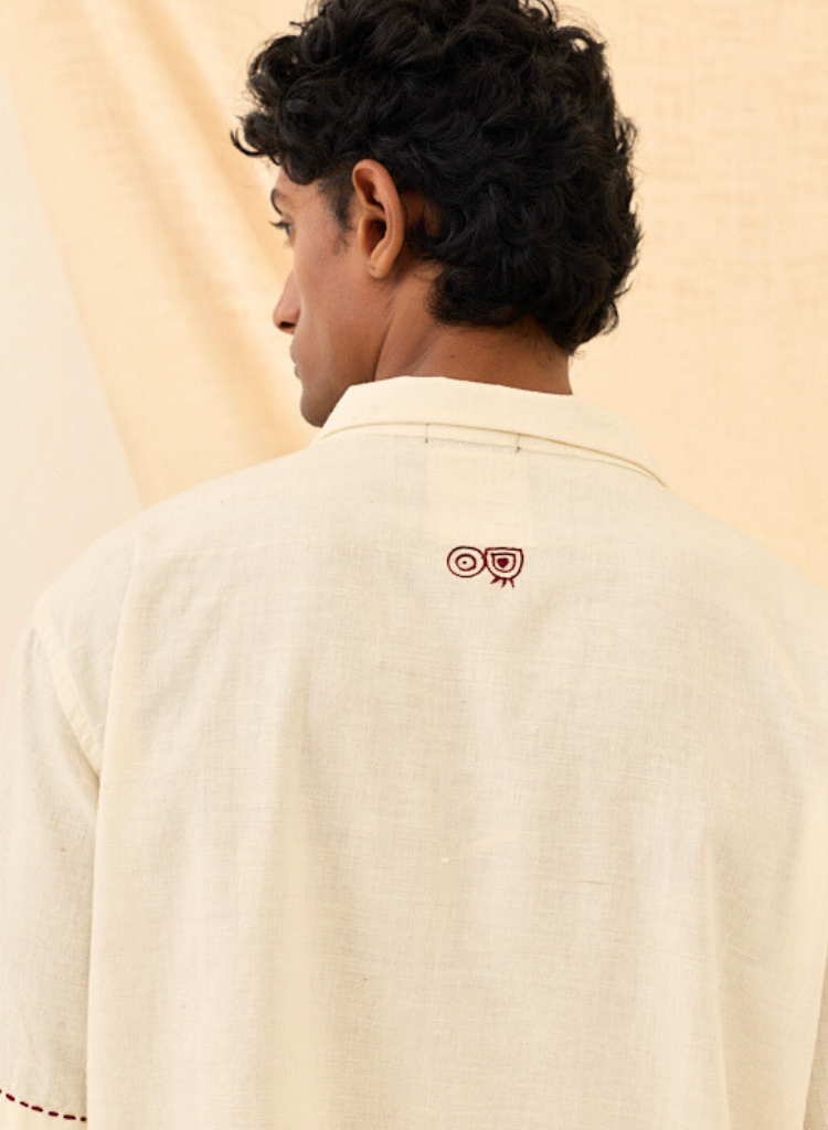 A relax fit shirt with playful hand-embroidery featuring an open collar and front buttons. Length 29". The model is 6'2" and is wearing a size M.