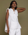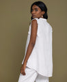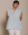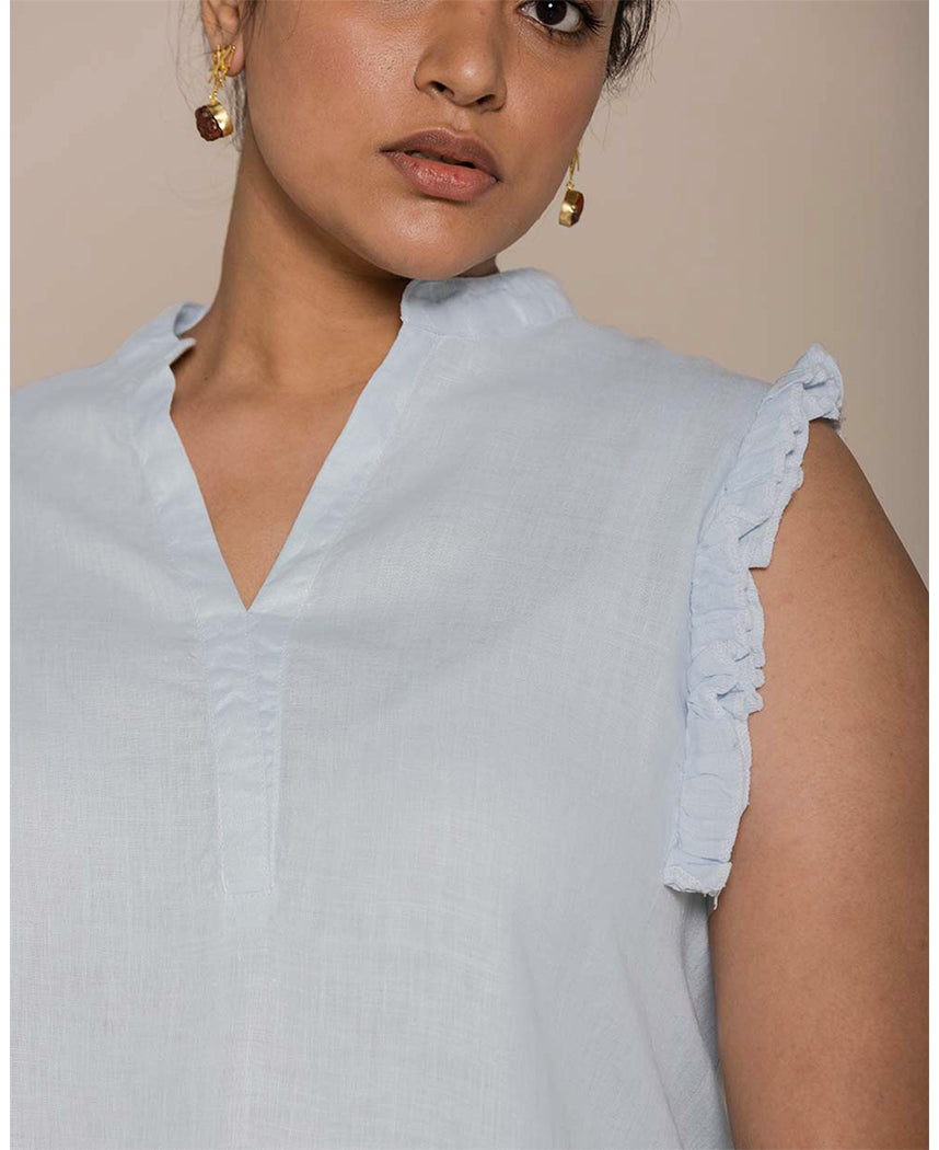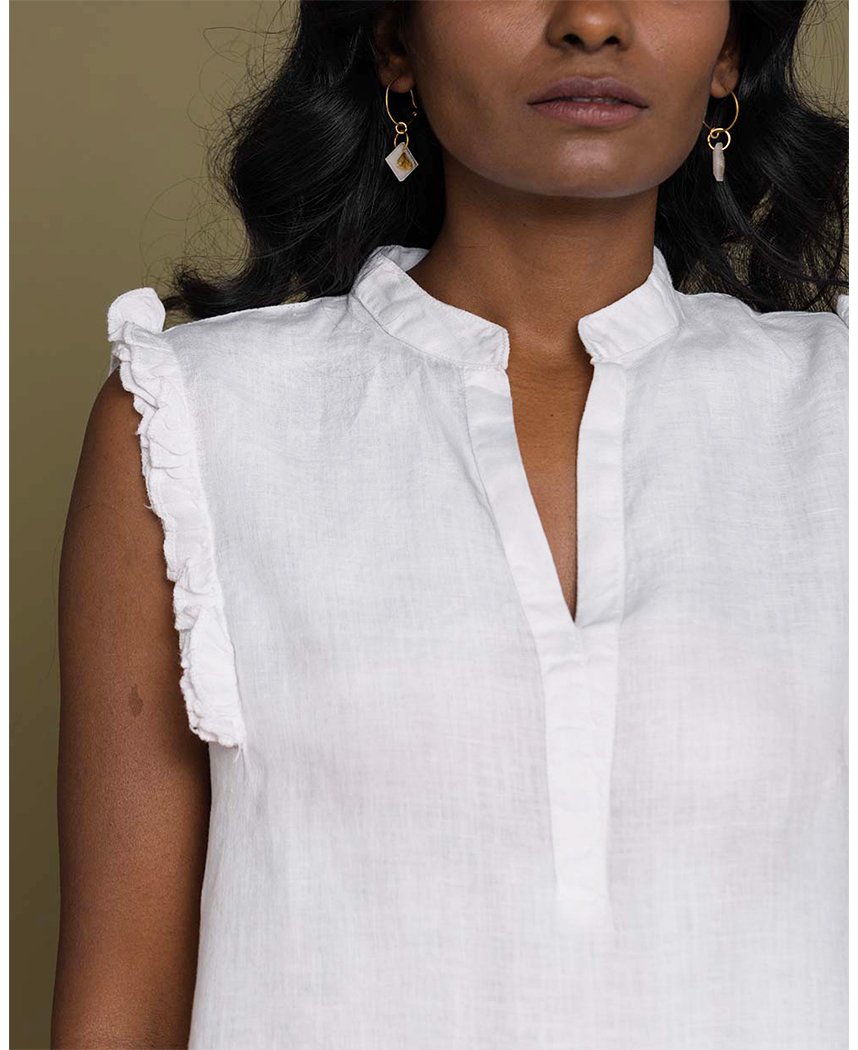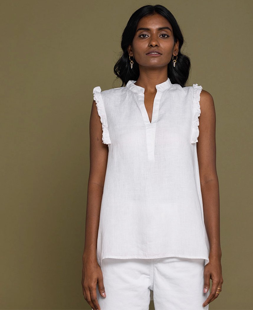 A relaxed sleeveless blouse with ruffle details at the armholes. Features a mandarin V-neck and a slight high-low hem. Length 25" - 28" based on size. The model is wearing XS.