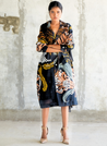 A double-breasted collared trench coat with a bold botanical print and an asymmetric scarf panel on the back. Features a front button placket, inseam pockets a separate tie-up belt. Length 41". The model is 5'5" and is wearing size S.