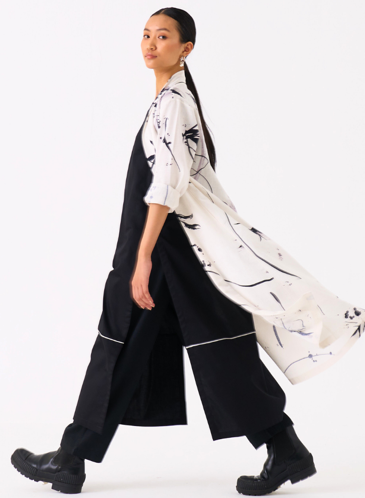 Wrap Collar Overlay with a floral print features a front button closure and inseam pockets. Length 44". The model is 5'7" & is wearing size S.