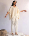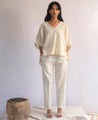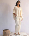 A two piece set pairing the Yanosha Top and the Yanosha Pants. The free-size kaftan top features a V-neck and kimono sleeves. The pyjama style pants feature a fitted front, an elasticated back and inseam pockets. The model is 5'6" and is wearing size S.