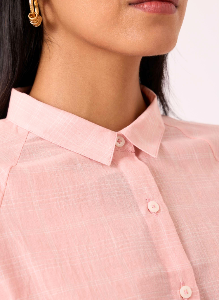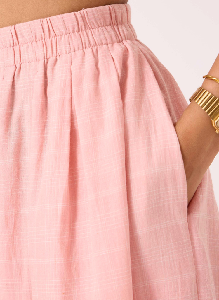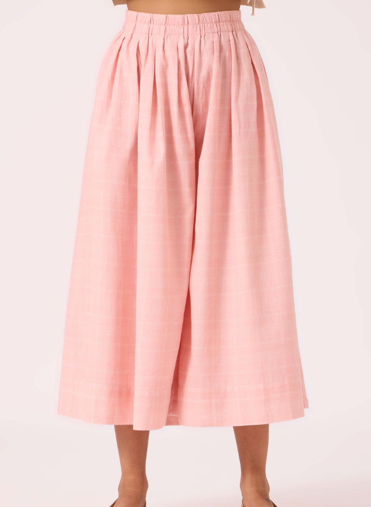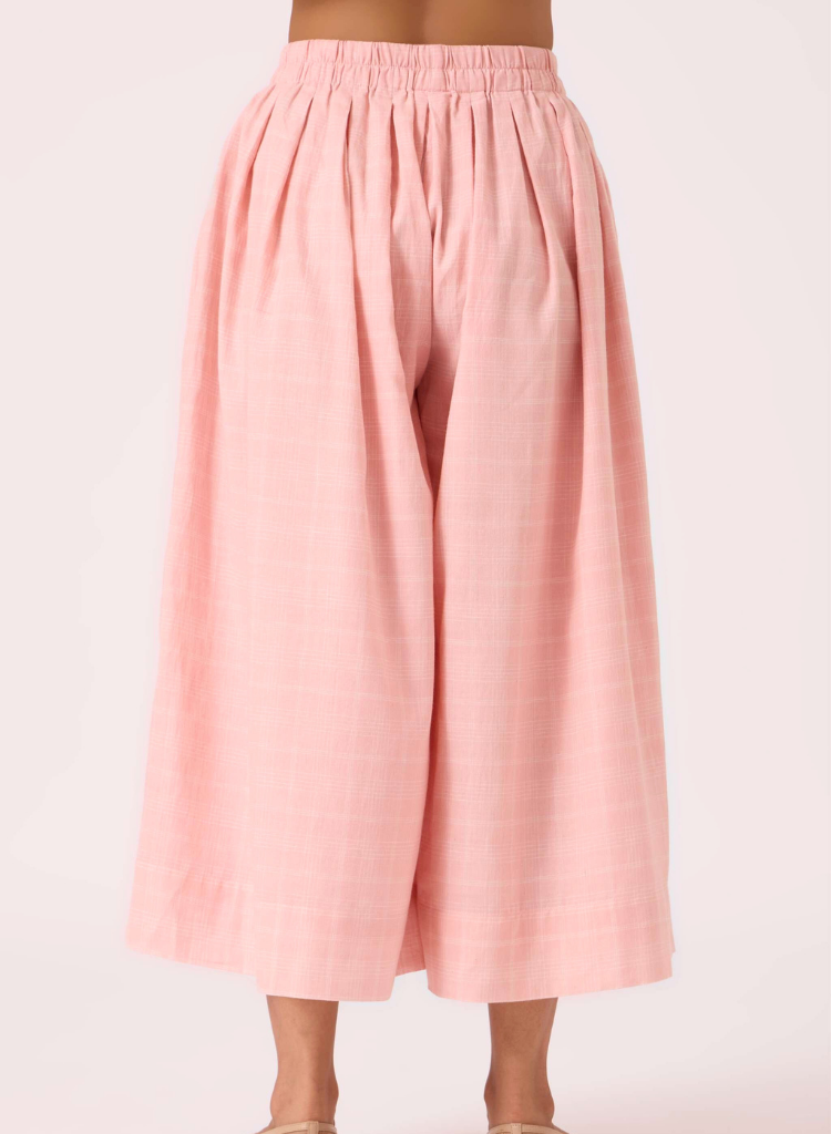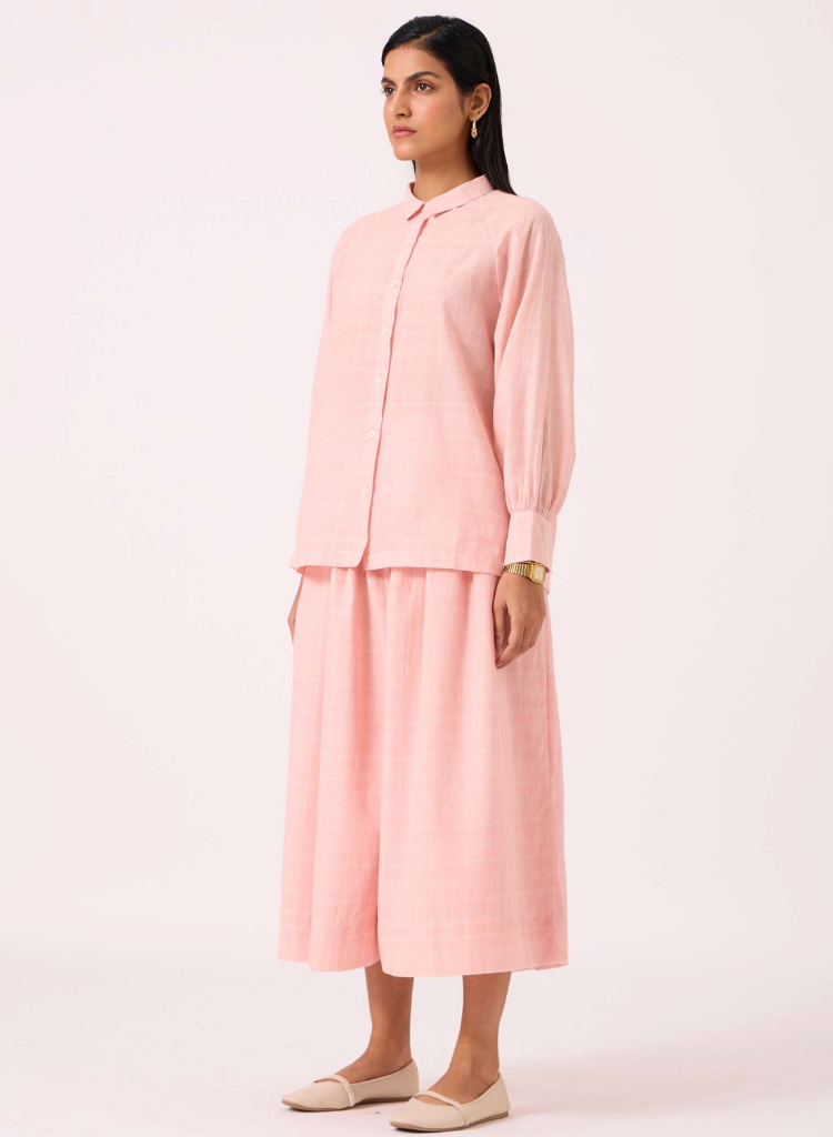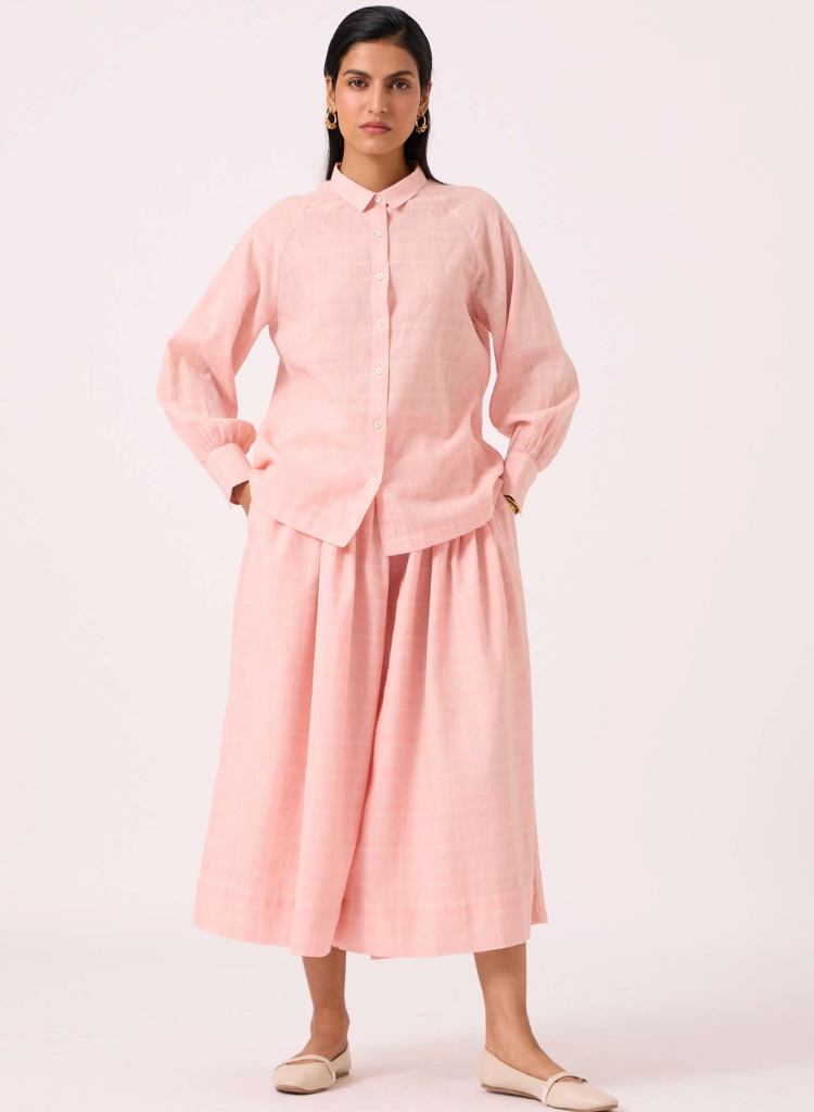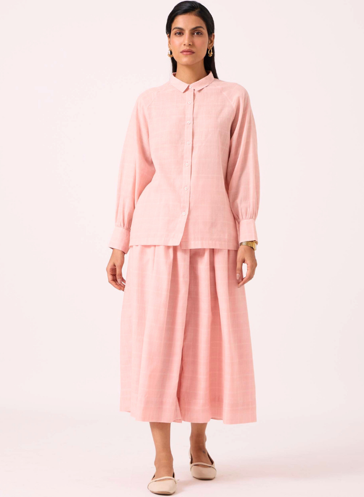 A two-piece set pairing the Yeji Handwoven Shirt and the Douglas Handwoven Pants. The relaxed fit shirt features a front placket with a button fastening, raglan bishop sleeve with wide cuffs and a back yoke with gathers. The pleated trousers with a bounteous flare features a fully elasticated waistband and inseam pockets, lined. The model is 5'6" and is wearing size XS.