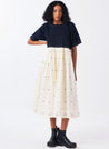 A relaxed fitting midi dress with a handblock printed polkas. Features a round neck, stitch line details and inseam pockets. Length 47". The model is 5'9" & is wearing size S.