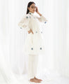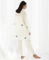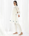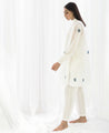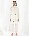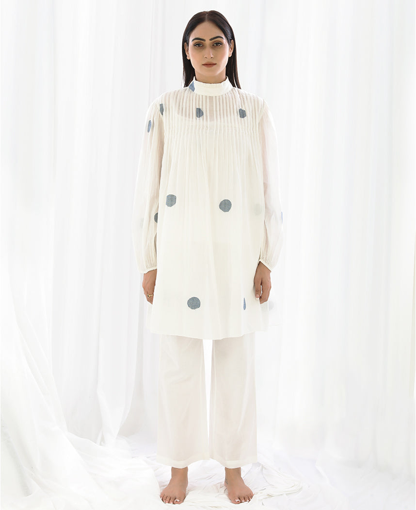 A two-piece set pairing the Yoke Pleat Top and Bright White Bottom. Made in handwoven cotton. The polka dot top features pin-tuck details on the yoke, a ruffle collar and gathered sleeves. Comes with a short slip. Length 35". The straight leg pants feature inseam pockets and an elasticated waist. Unlined. Length 38".