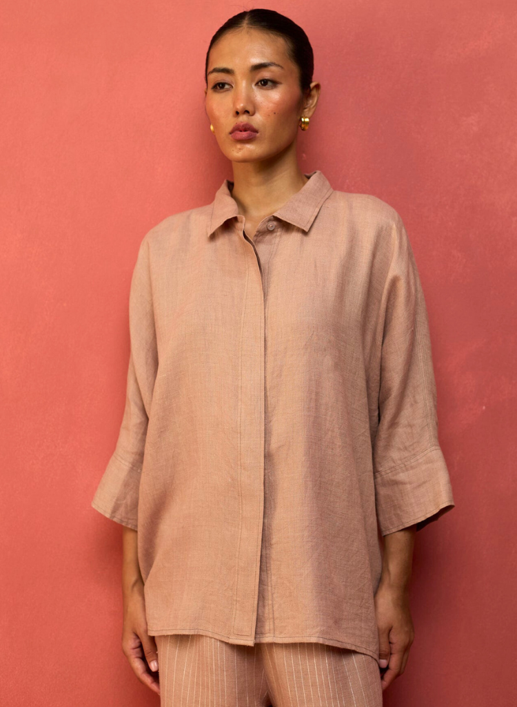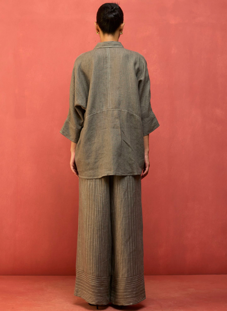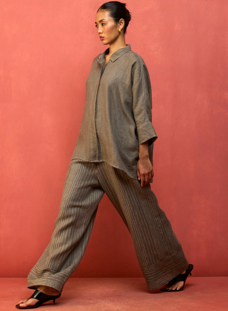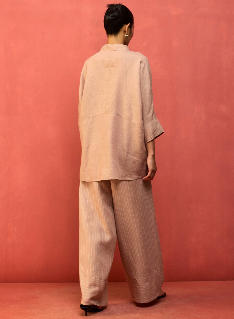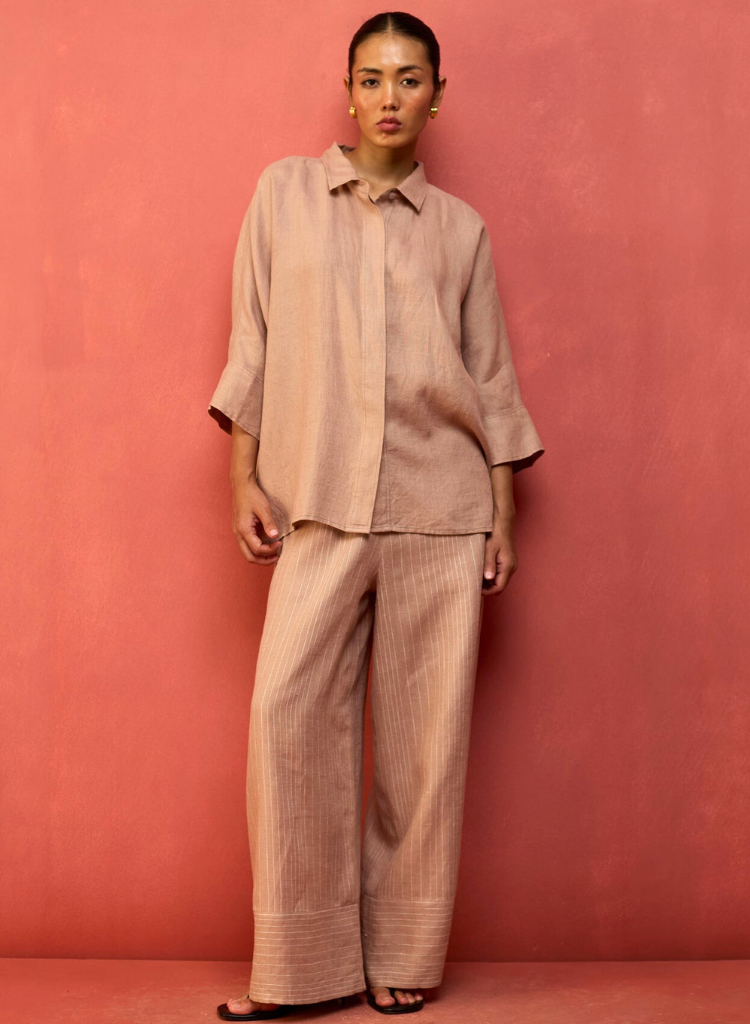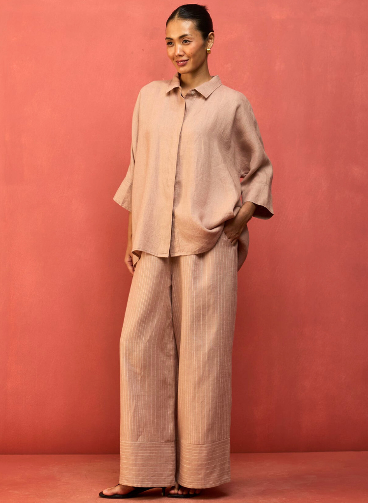 A two-piece set pairing the Yoko Forever Shirt and the Juno Stripe Pants. The relaxed-fitting drop-shoulder shirt features a classic collar and hidden placket with mother-of-pearl buttons for a clean, contemporary look. The striped wide - leg palazzos feature a soft drawstring and an elasticated back for comfort. The model is 5'8" and is wearing a size S.