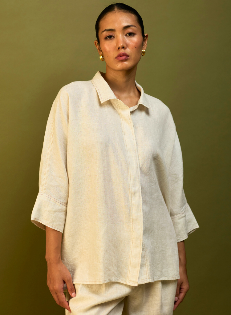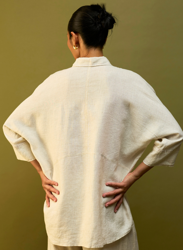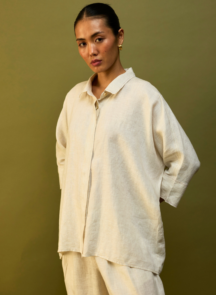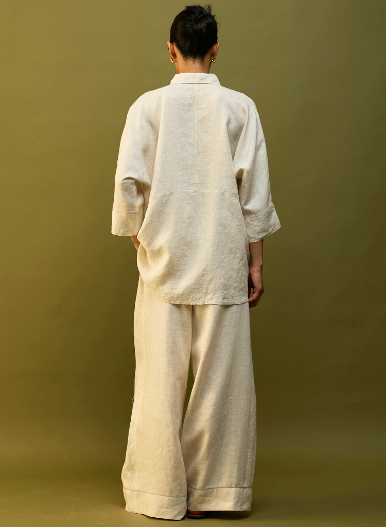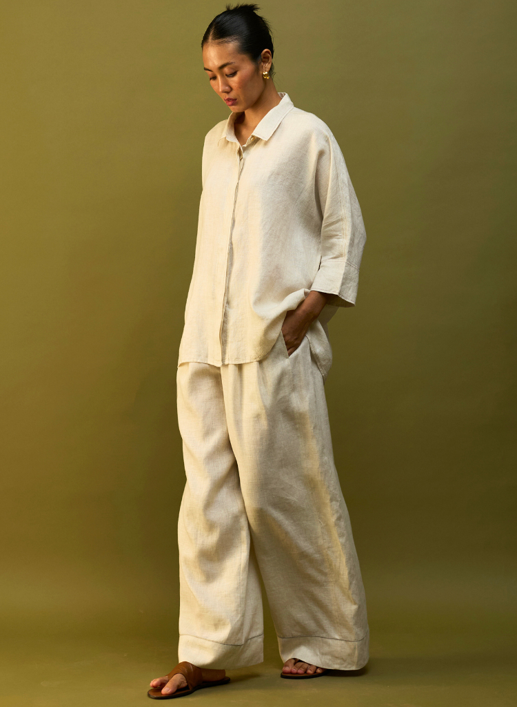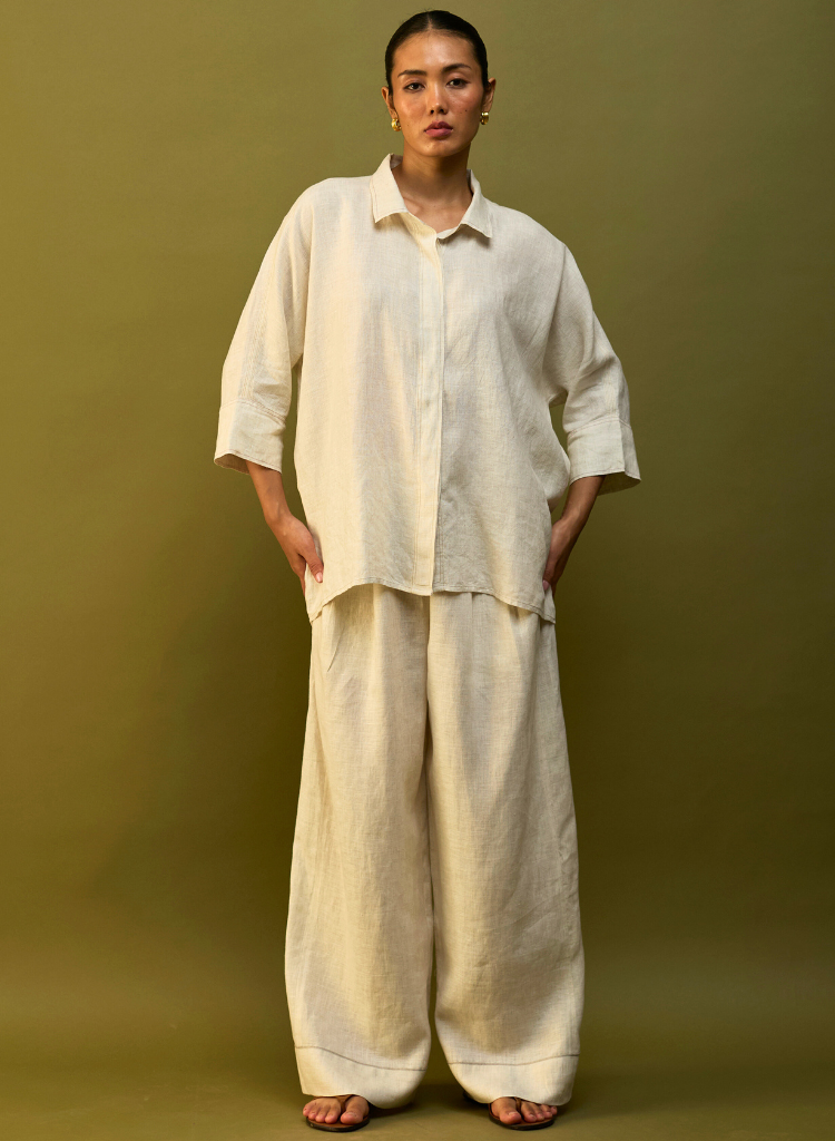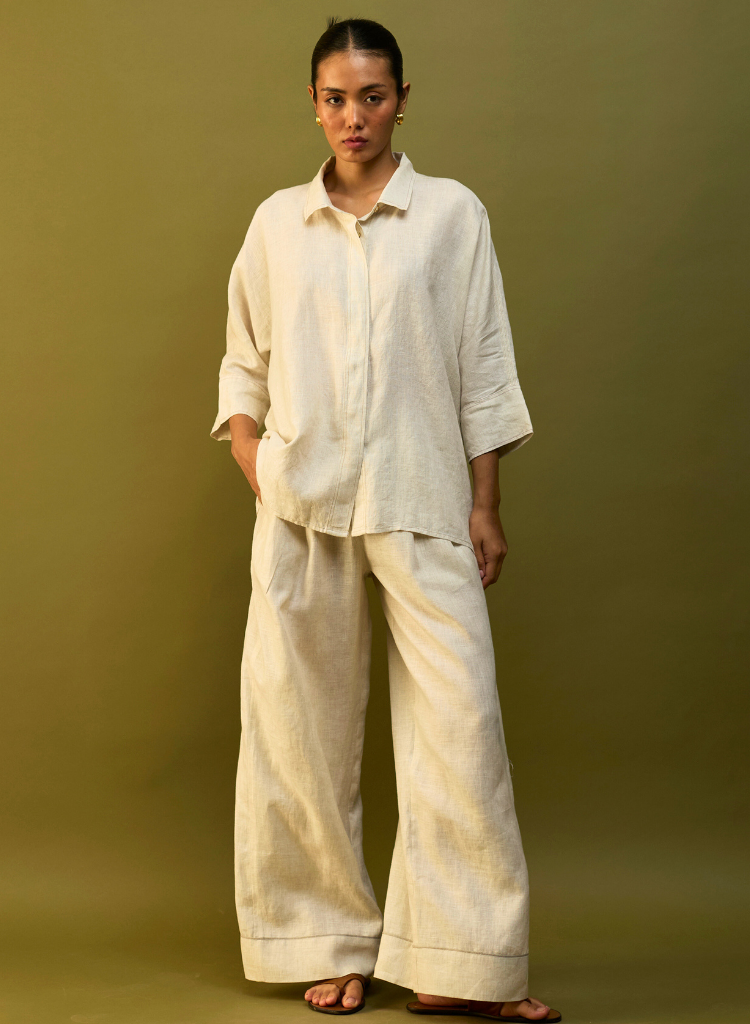 A two-piece set pairing the Yoko Forever Shirt and the Mekko Pleated Pants. The relaxed-fitting drop-shoulder shirt features a classic collar and hidden placket with mother-of-pearl buttons for a clean, contemporary look. The palazzo is designed with pleats at the waistband with a drawstring, practical side pockets, and a soft elasticated back for all - day comfort. The model is 5'8" and is wearing a size S.