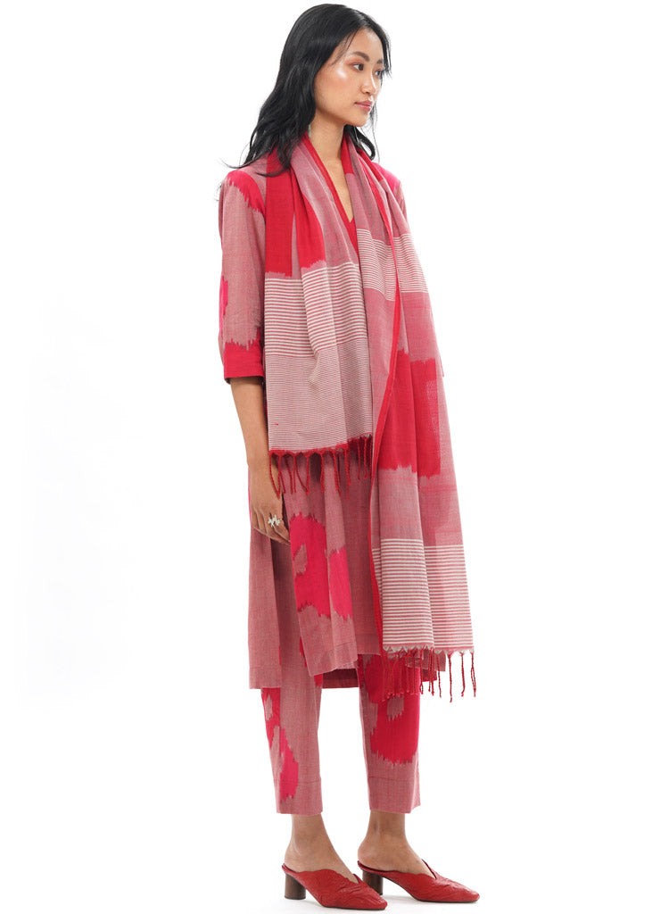 An Ikat woven scarf which is a perfect addition to your closet to add just the right amount of colour. Dimensions - 22" x 79".