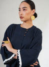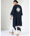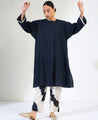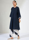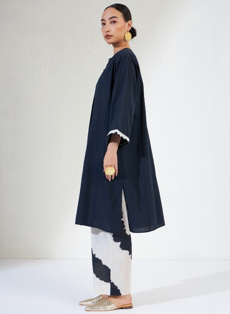 A two-piece set pairing the Zoya Tunic and the Zoya Pants. The relaxed fitting kurta with hand embroidery details features a round neck, wide sleeves and side slits. Length 40". The clamp dyed pants feature an elasticated waist. Length 37".